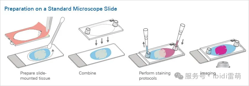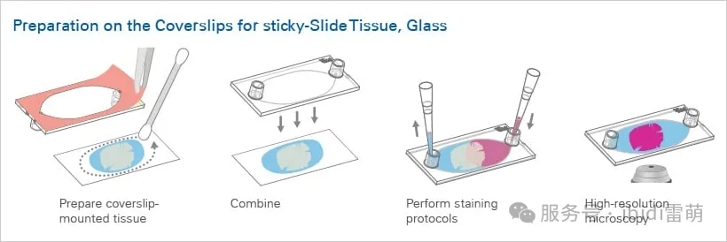 實(shí)驗(yàn)工作流程: Sticky-Slide Tissue粘性-組織切片通道載玻片提供了一個簡單、便捷的工作流程,可在載玻片安裝的組織切片上創(chuàng)建一個節(jié)省空間的通道。在對組織進(jìn)行脫石蠟處理和再水化后,取下襯底并將粘性載玻片放在顯微載玻片上,即可為組織切片創(chuàng)建一個方便的染色室。 使用移液管手動執(zhí)行染色方案,或使用自動化設(shè)備(如管路和泵等)進(jìn)行多重染色。
